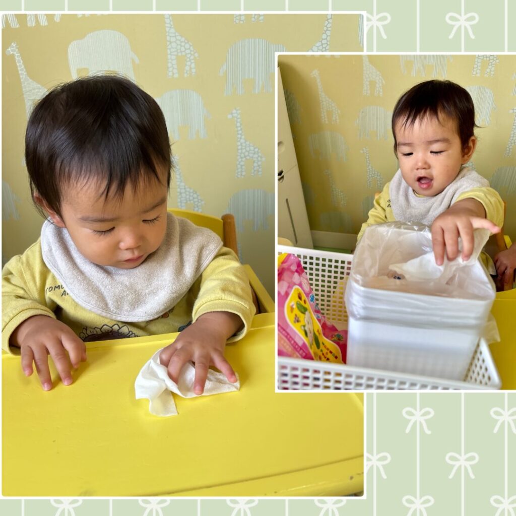 食後に口や手を拭いて、テーブル拭きもせっせとしてくれます。