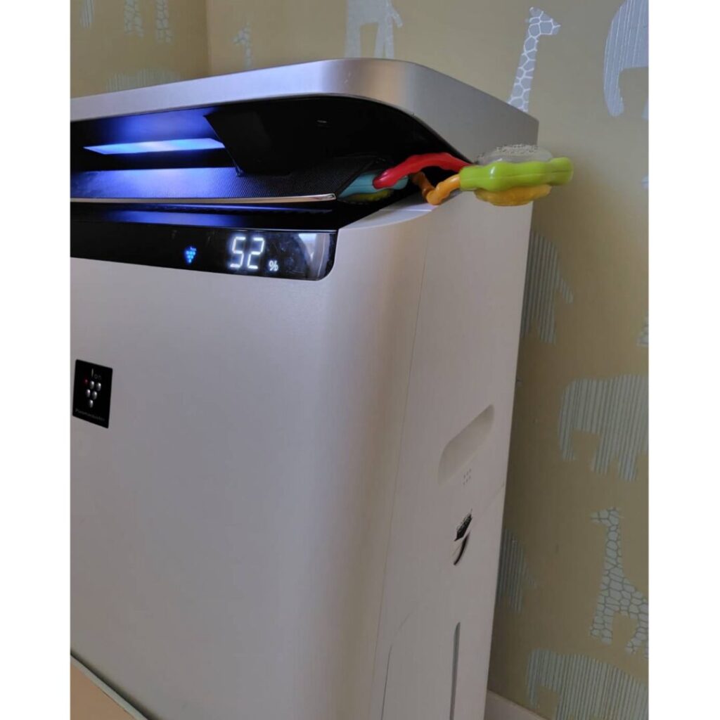おひさま組のお部屋の働き者の空気清浄機。……誰ですか?おもちゃを飾りつけしたのは。