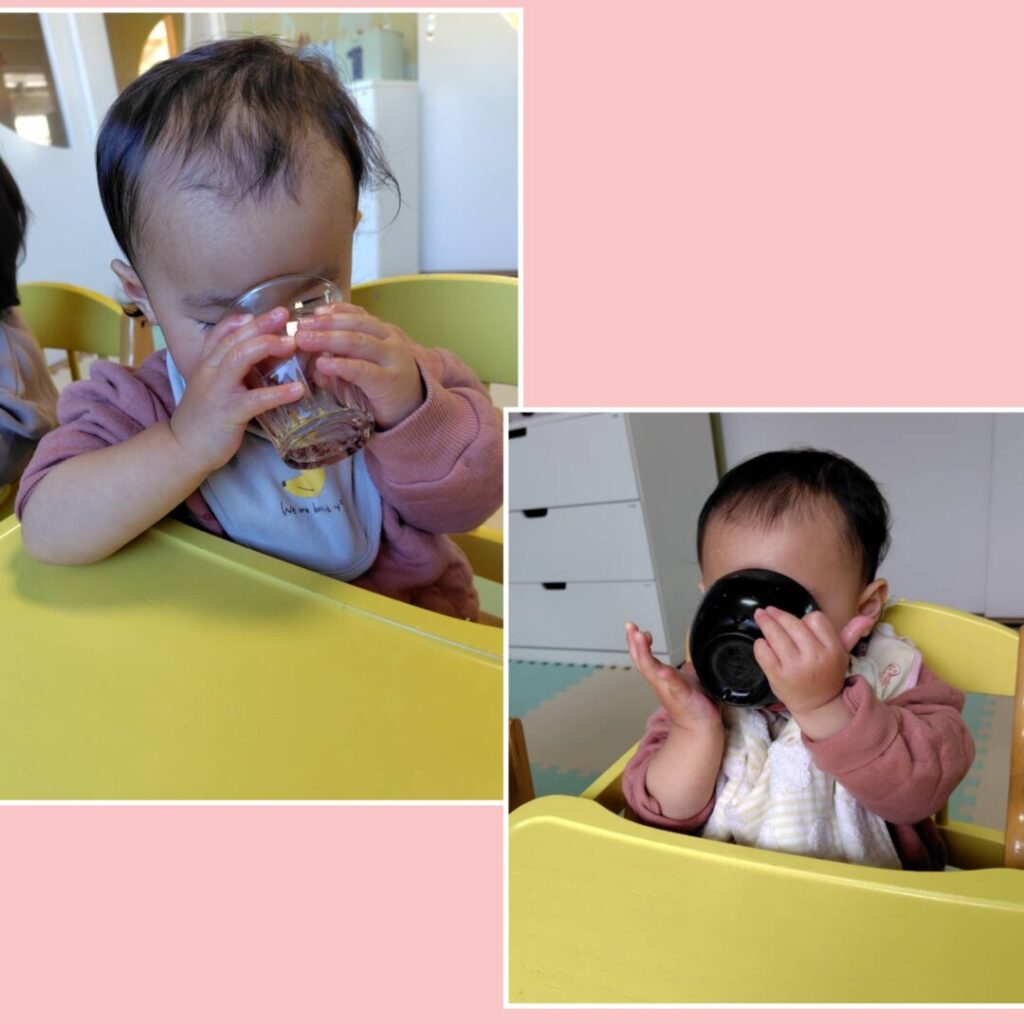 真ん中ちゃんは、コップやお椀を両手で持って飲めるようになりました。