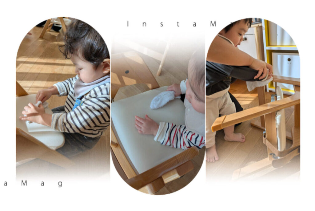 椅子やロッカー、保育室の床もゴシゴシ。「綺麗になったね。」「ピカピカ。」との会話する声も聞こえてきました。