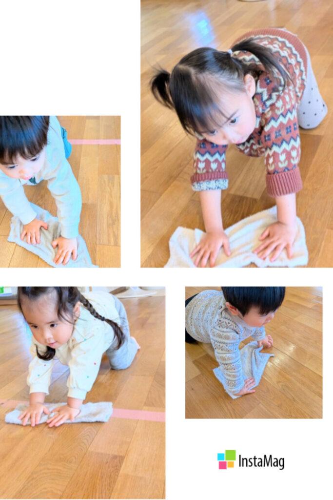 そら組のお友だちはロッカーをお掃除するのに、隅々まで雑巾掛け。一生懸命奥まで拭いたので、背中が出てしまっているのにも気づかず‼︎素敵な姿ですね♪