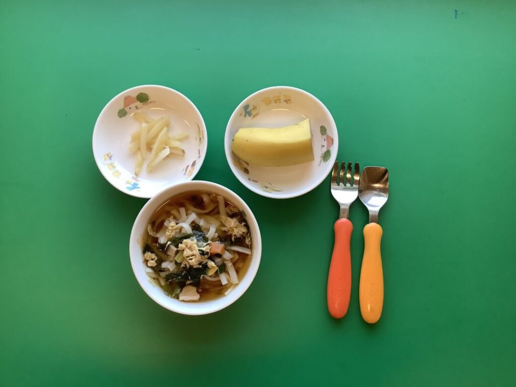 煮込みうどん・牛乳・じゃが芋のソテー・果物