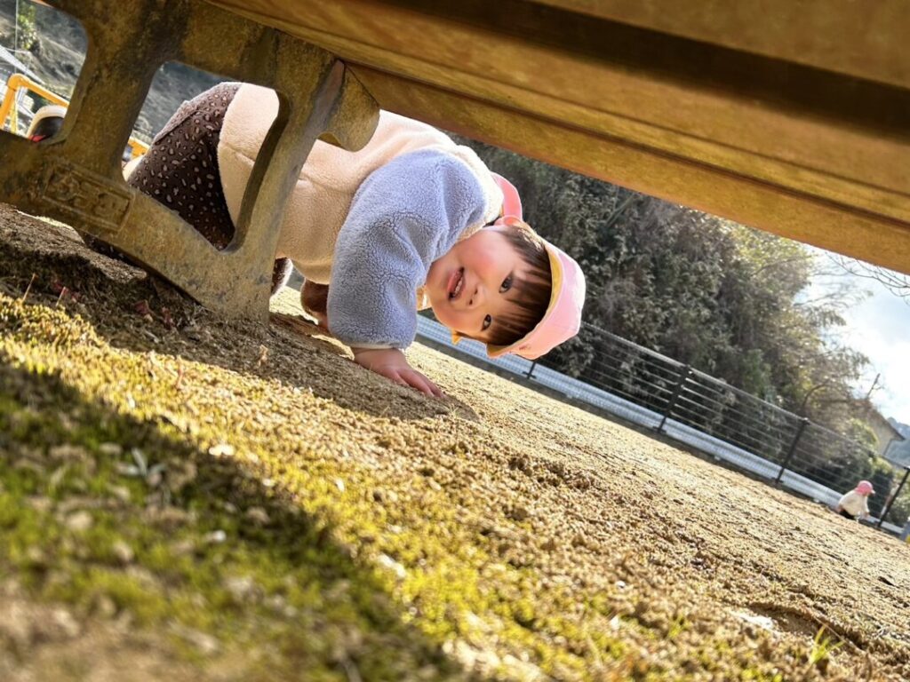 Sくんはベンチの下から「ばあ😊」