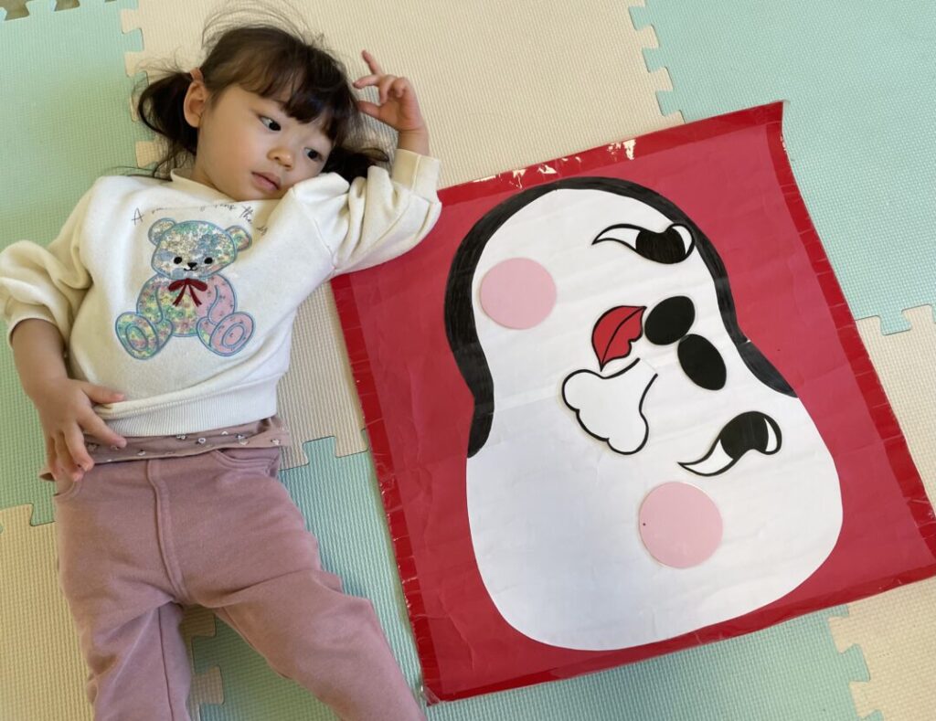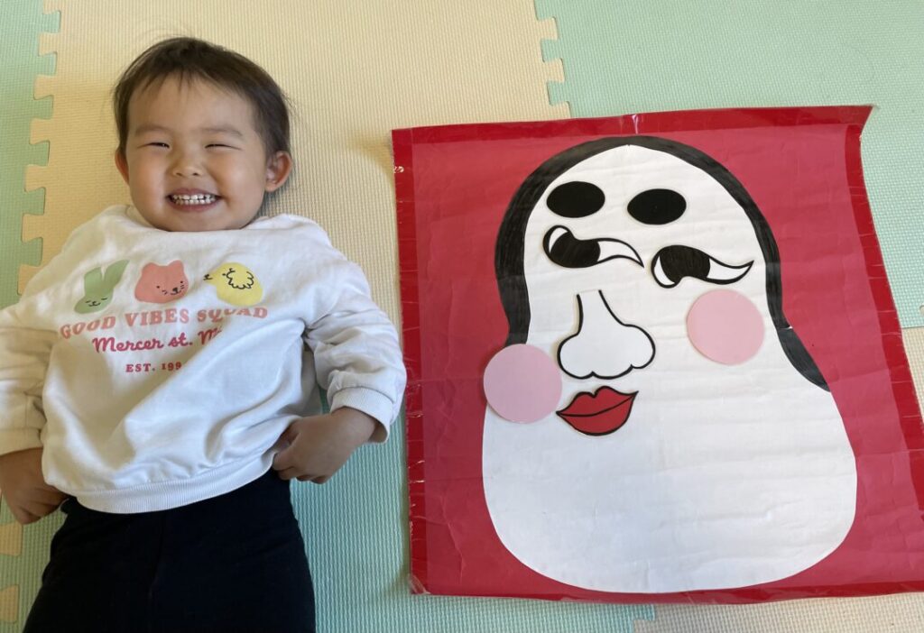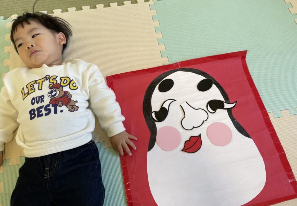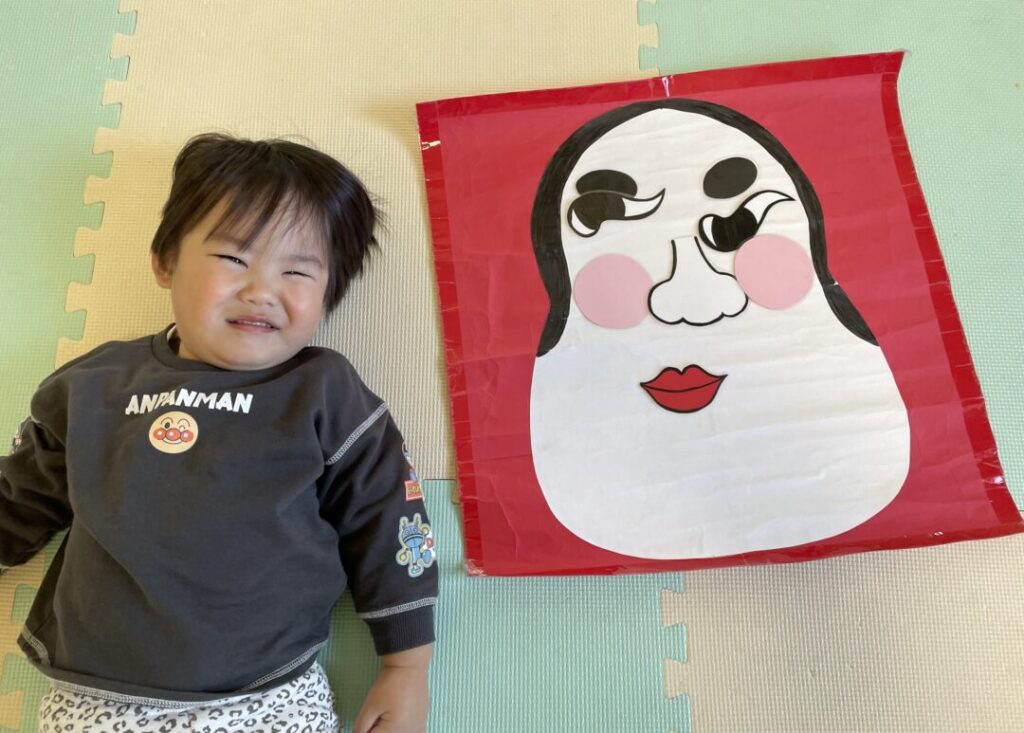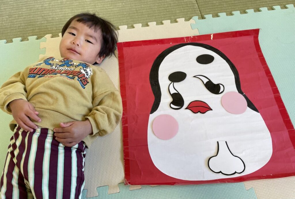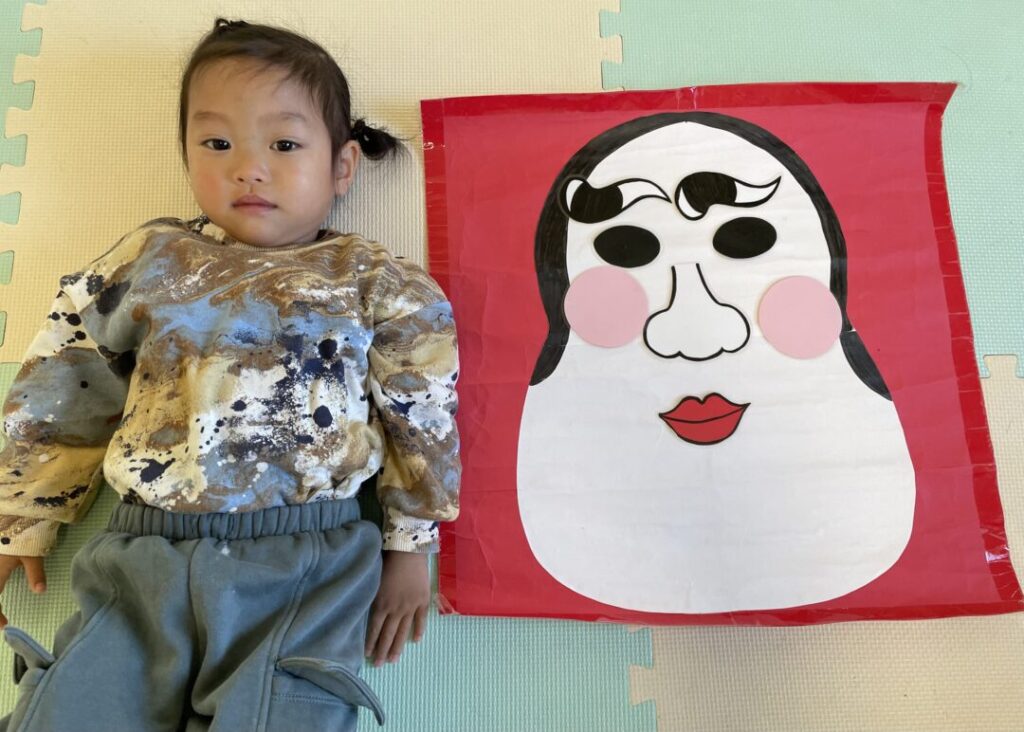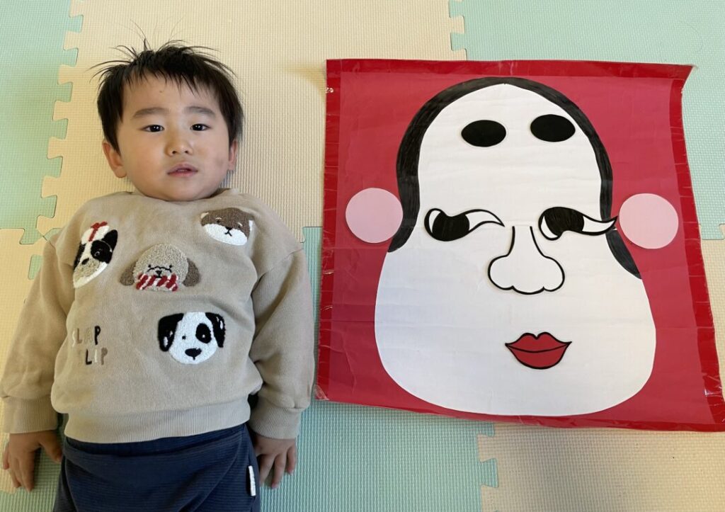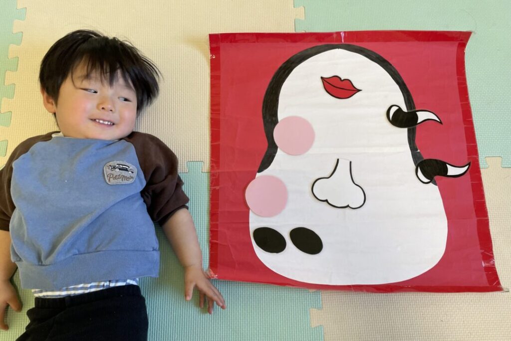 各クラスそれぞれお正月遊びを楽しんでいますがひかり組は、こま回しの他に「福笑い」で遊んでみました。