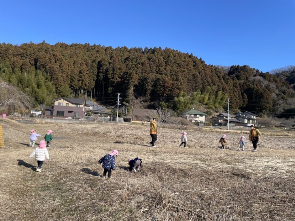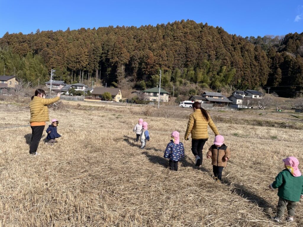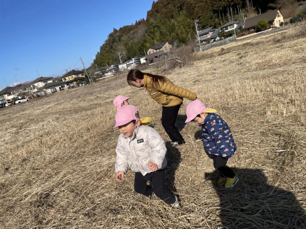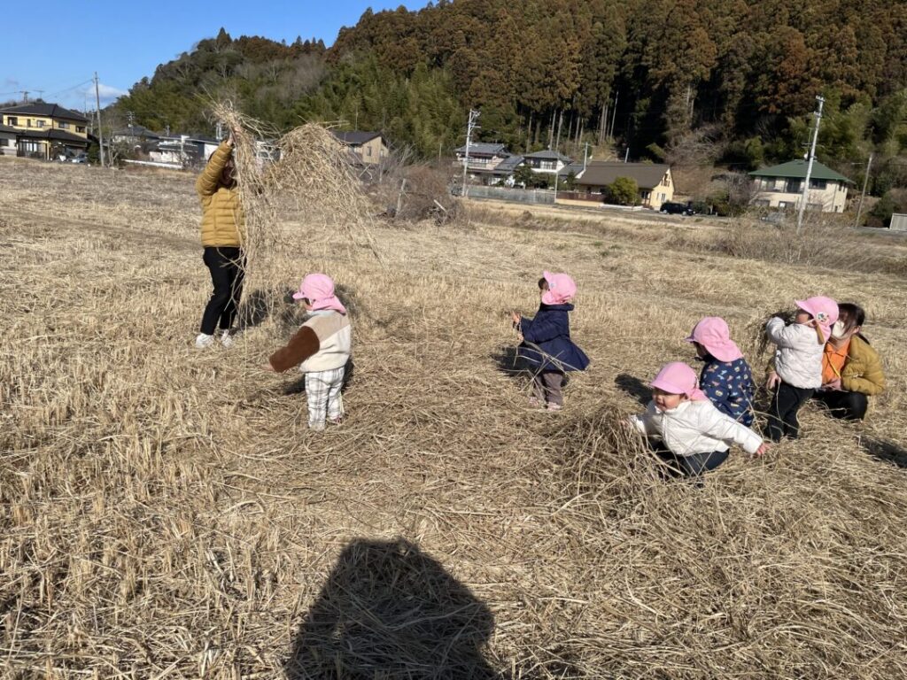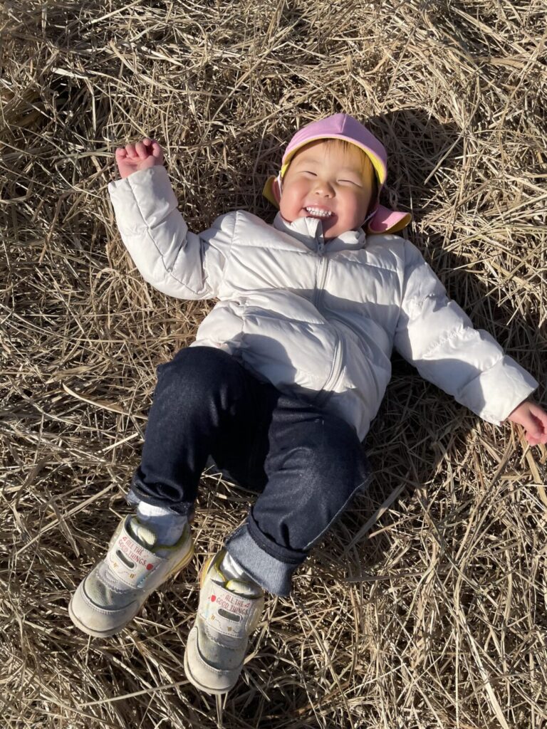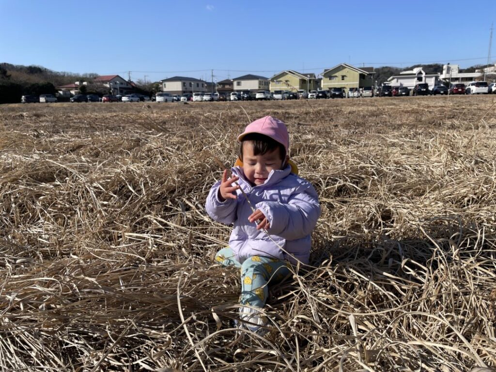 広ーい原っぱを歩いたり、ワラのような上でジャンプしたり、寝転んだり、風に任せてバラバラとワラを散らしたりして遊びました。