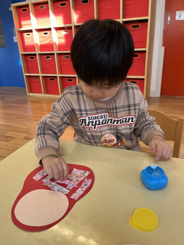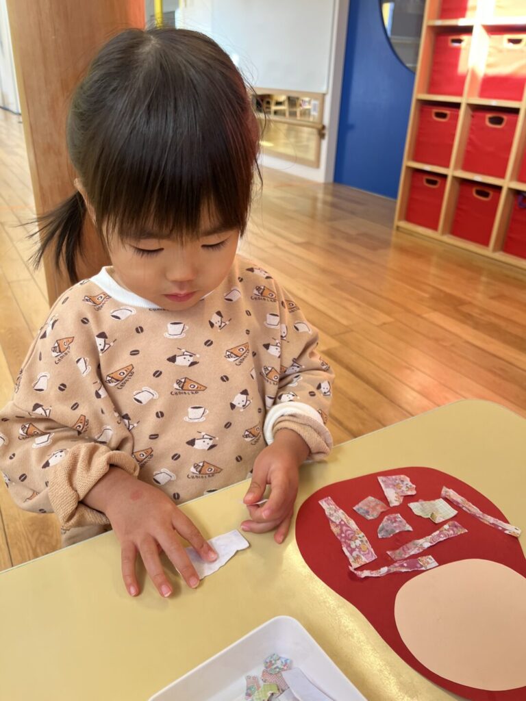 自分でちぎった折り紙をのりで貼りました。
