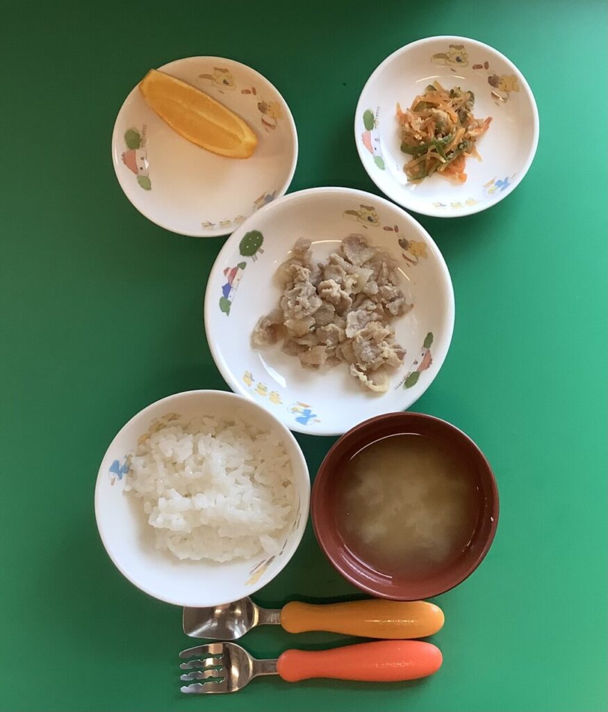 ご飯・味噌汁・豚肉の梅みそ焼き・にんじんしりしり・オレンジ