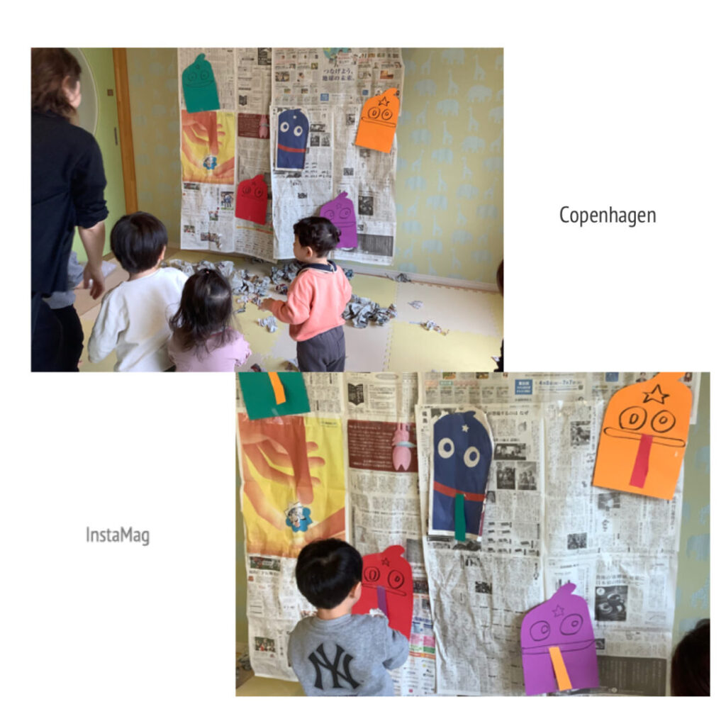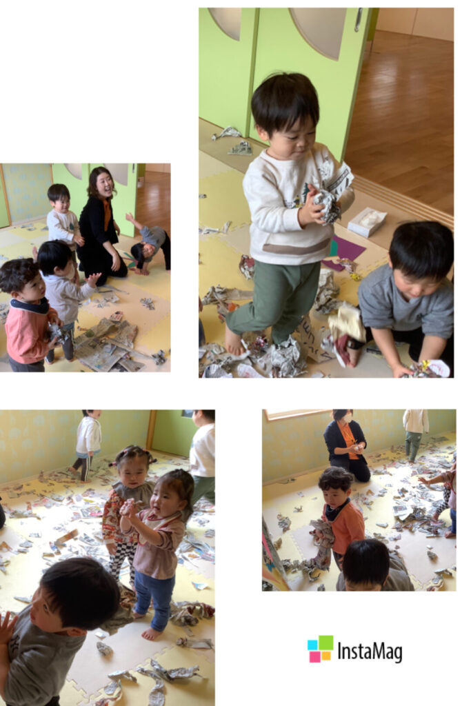 おひさま組、ひかり組合同で『新聞ビリビリ』をしました。細く長くゆっくりと破る子、細かく小さく破る子、丸めてボールにする子と自分で考えながら楽しく遊んでいました。的当ても始まり、「え〜い!!」と力いっぱい投げたり、Y君は新聞のお洋服を着てみたりしました。
