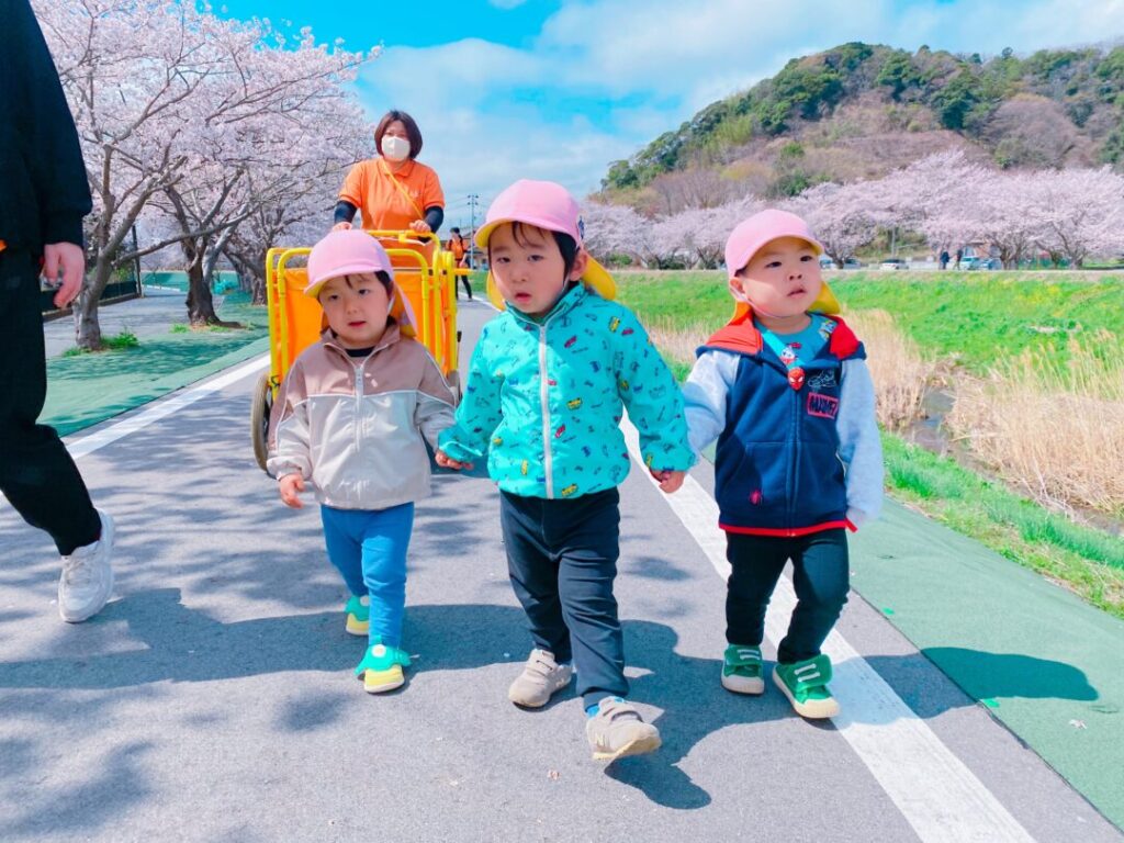 手を繋いで歩くそら組さん😊「桜だね~🌸」「鴨もいたよ~」など会話も楽しんでました♡