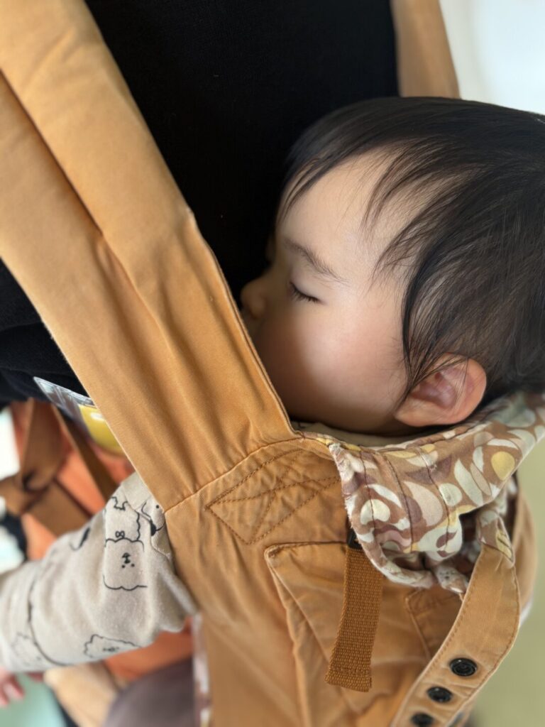 先生の背中で安心して寝てくれるのも、