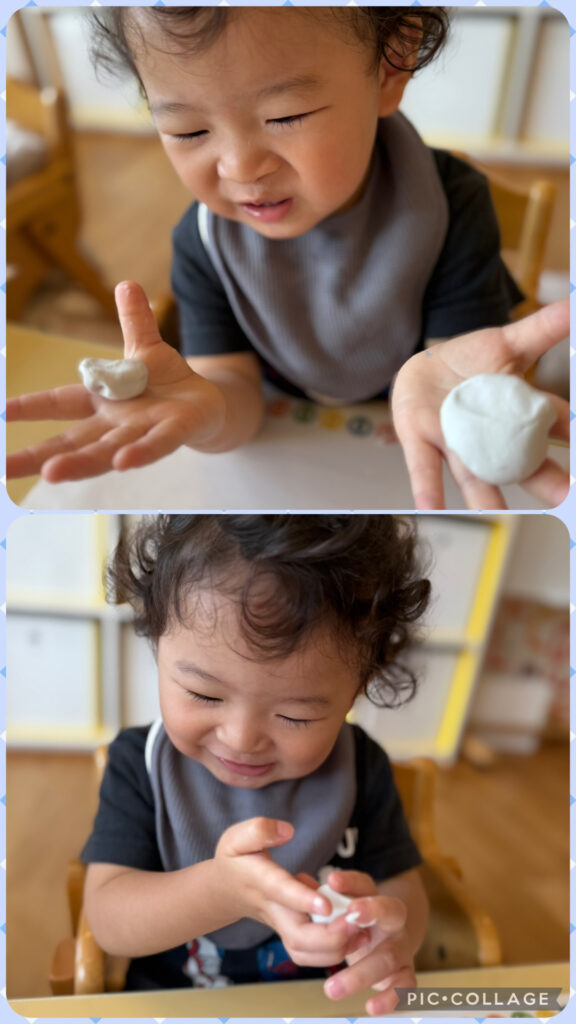 具体的な形を作ることはまだまだ難しいですが、粘土を触る、ちぎる、こねるなどを通して粘土の感触や温度、音、匂いなどを五感で感じ、表現する力を育むことを目的として活動に取り入れています!