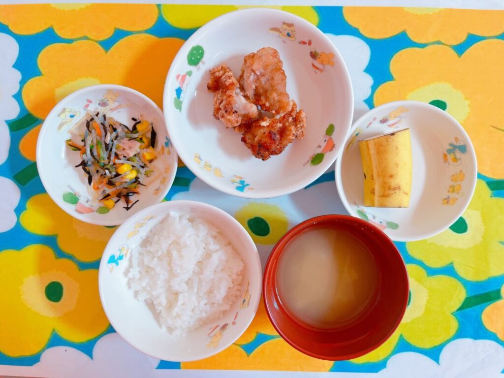 ・鶏肉の唐揚げ・ひじきの中華和え・ご飯・みそ汁・果物