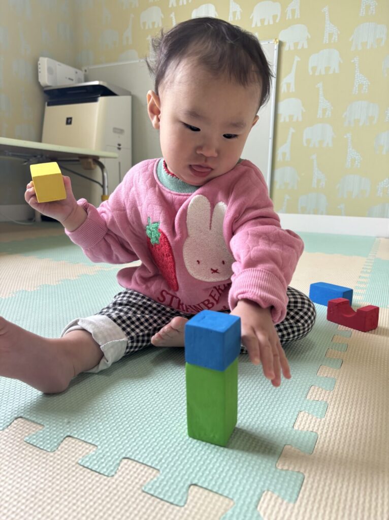 今月のおひさま組の知育遊びはブロックがテーマです。