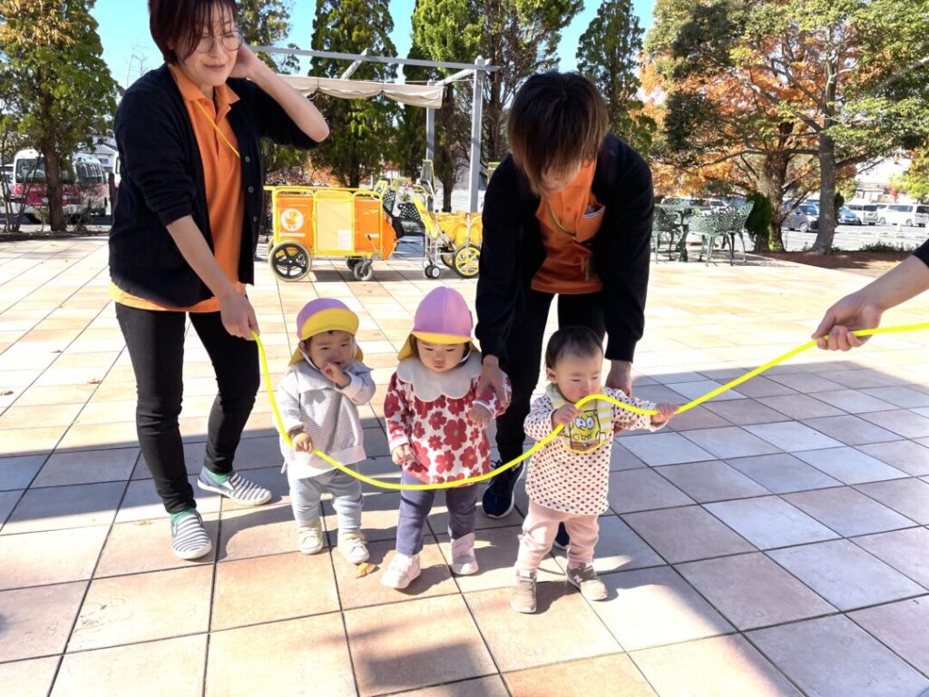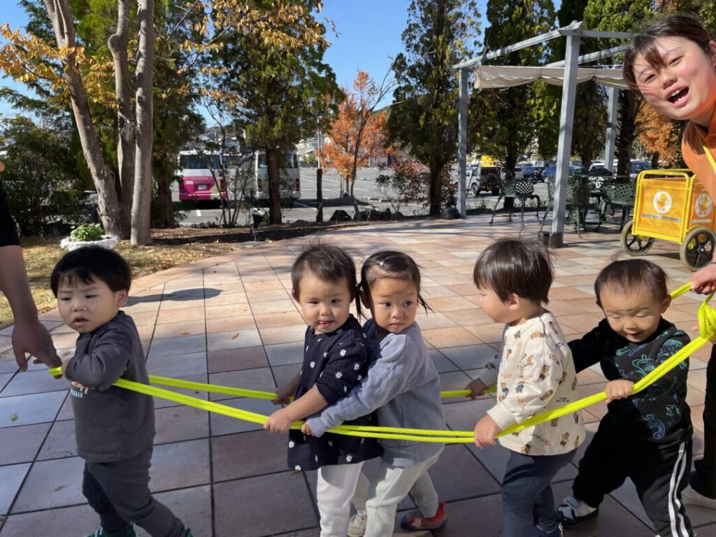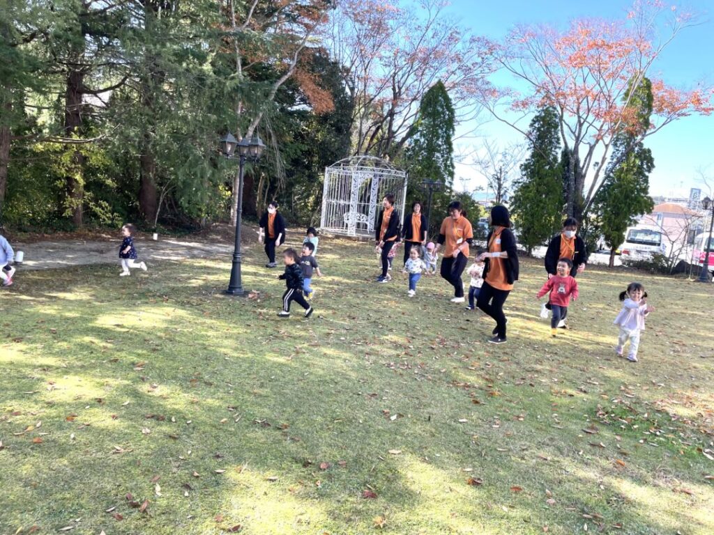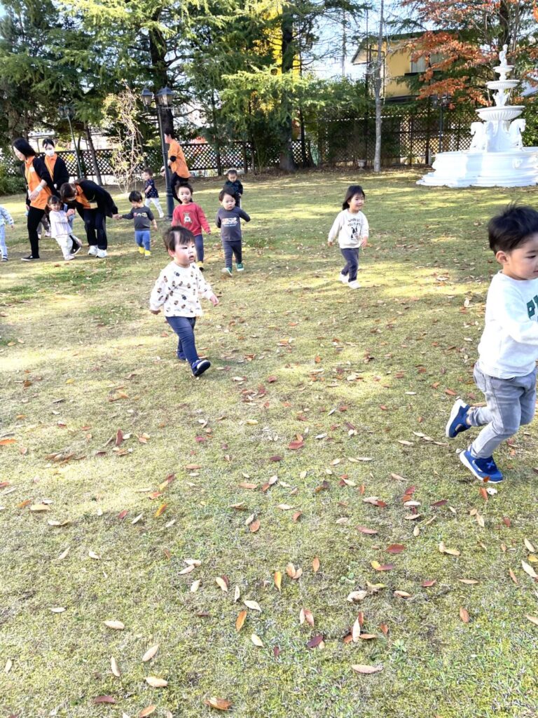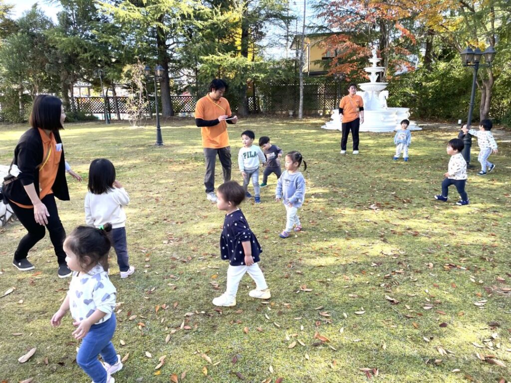 いつもは室内ですが、初めて戸外でのびのび身体を動かすことができ、子ども達も嬉しそう💕