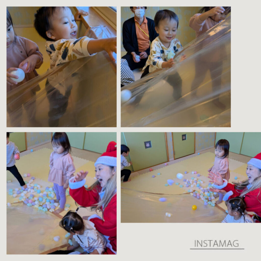 ボールコロコロや新聞紙トンネルを楽しみました。千佳サンタも一緒に。