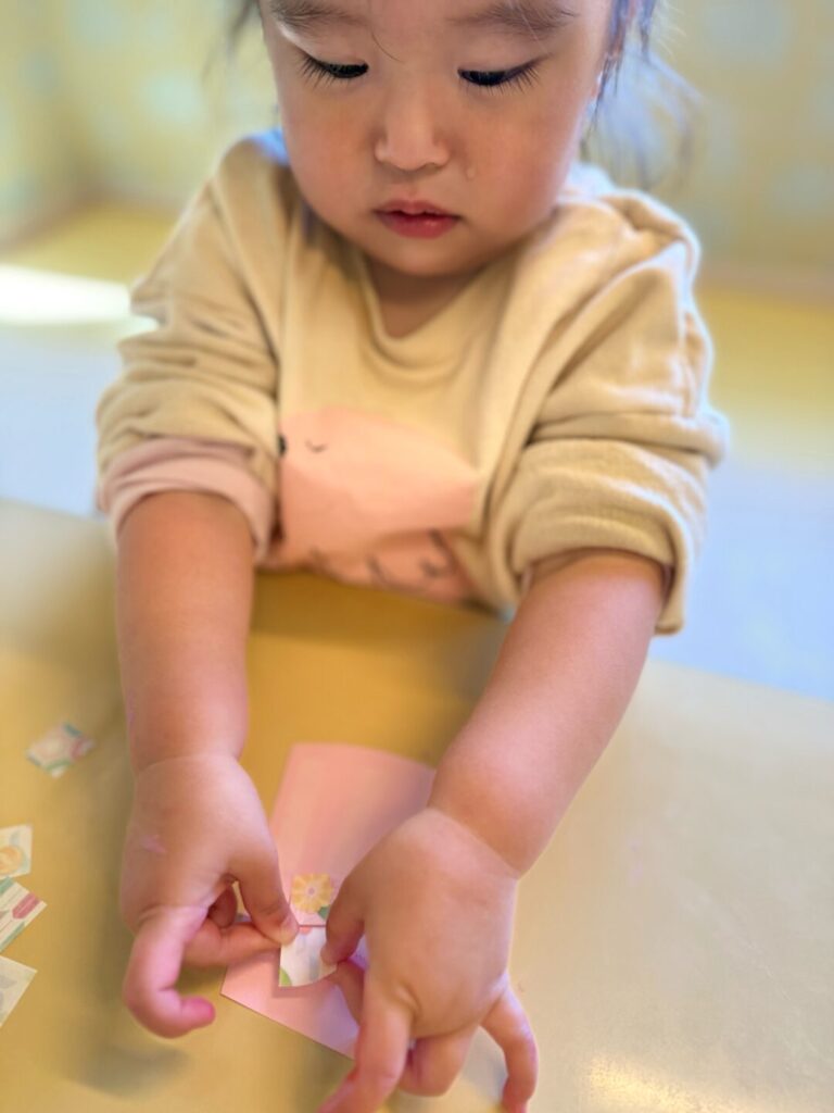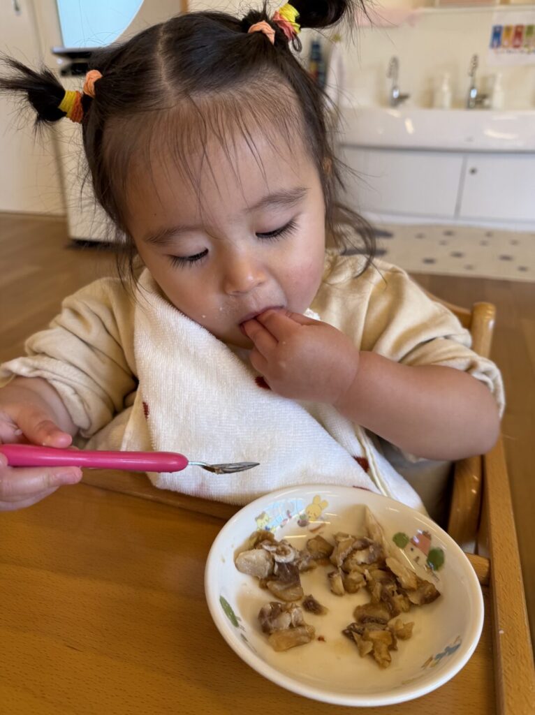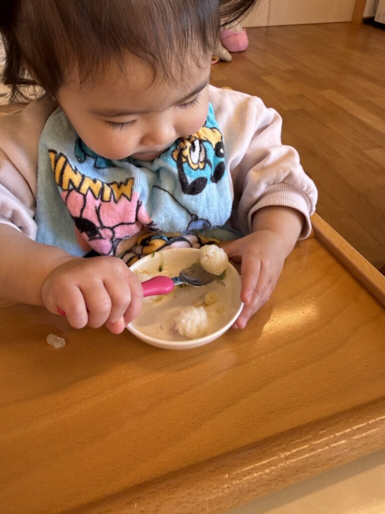 まだ手づかみ食べが多いですが、フォークやスプーンを使って食べるのも少しずつ上手になってきました👏