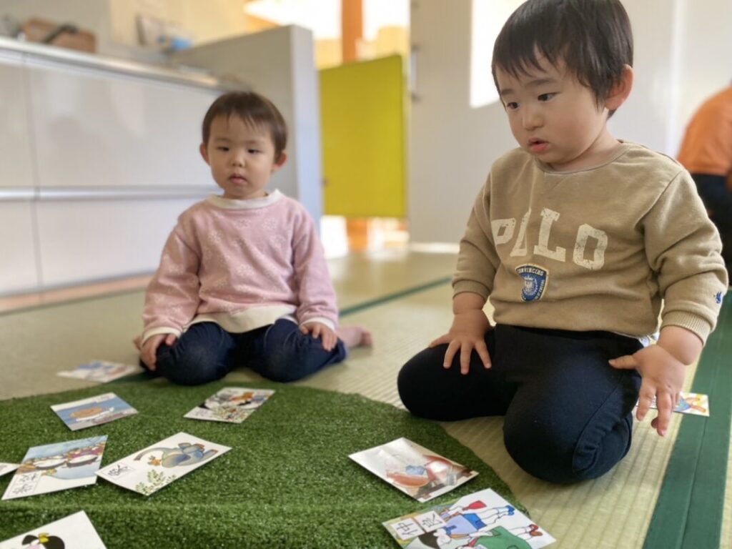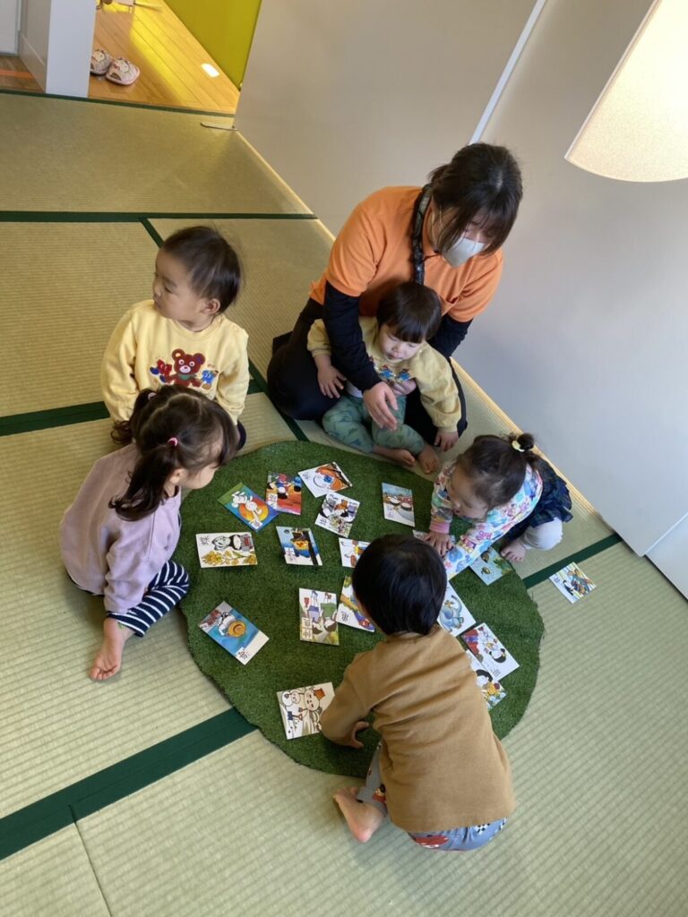 札とお歌が一致してきて、先生が歌を歌うと「これだ!」と手がしっかり札に伸びています。
