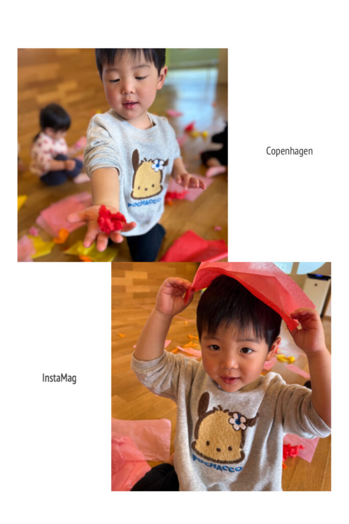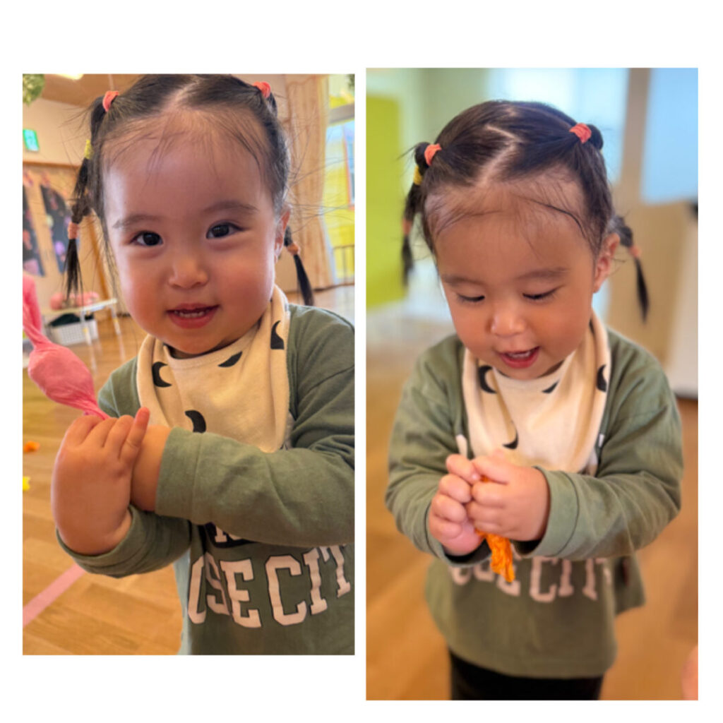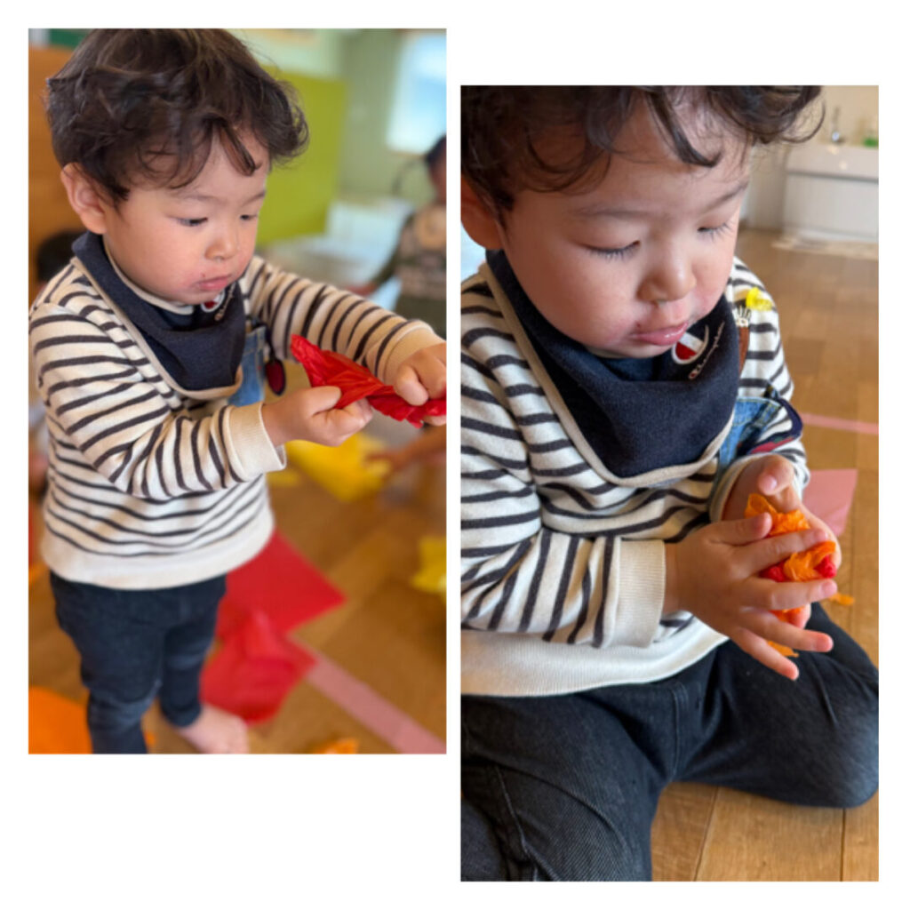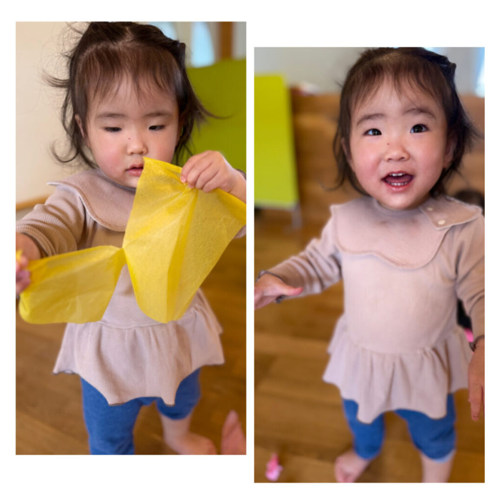 花紙をスカーフに見立てて「いないいないばあっ!」と楽しんだり、頭にのせて「帽子だよ!」とみせに来たり、とても集中して遊んでいました。一つの素材で自分たちで考え、遊びを広げていけるなんてすばらしいですよね。本当に毎日成長していますね♪