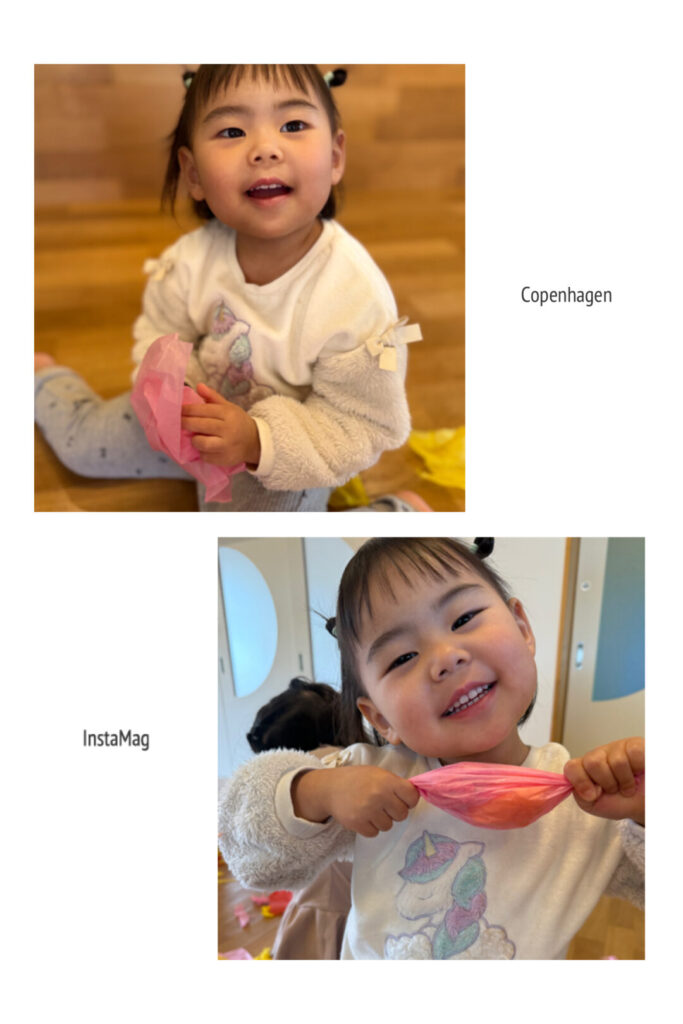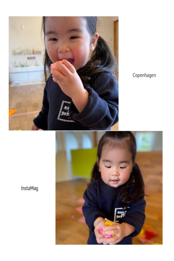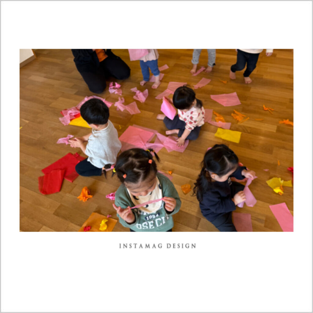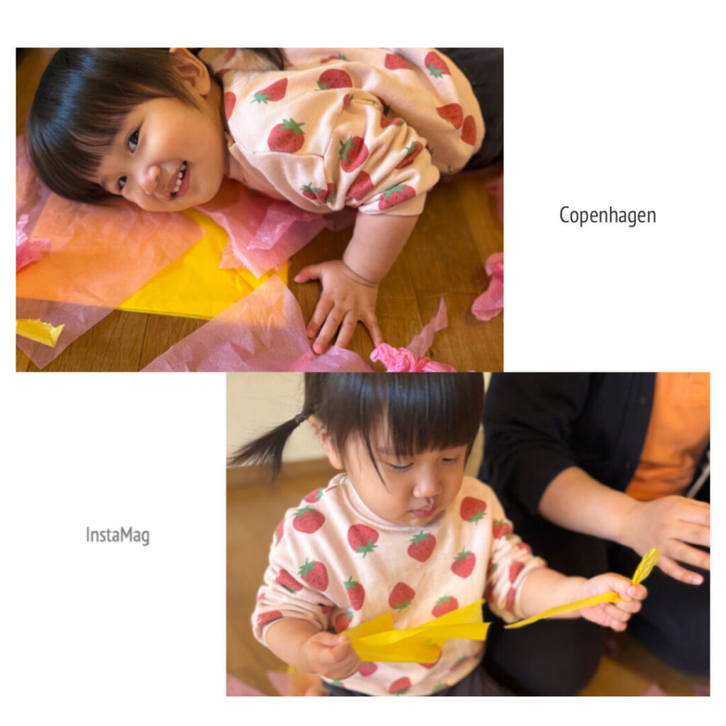 花紙をスカーフに見立てて「いないいないばあっ!」と楽しんだり、頭にのせて「帽子だよ!」とみせに来たり、とても集中して遊んでいました。一つの素材で自分たちで考え、遊びを広げていけるなんてすばらしいですよね。本当に毎日成長していますね♪