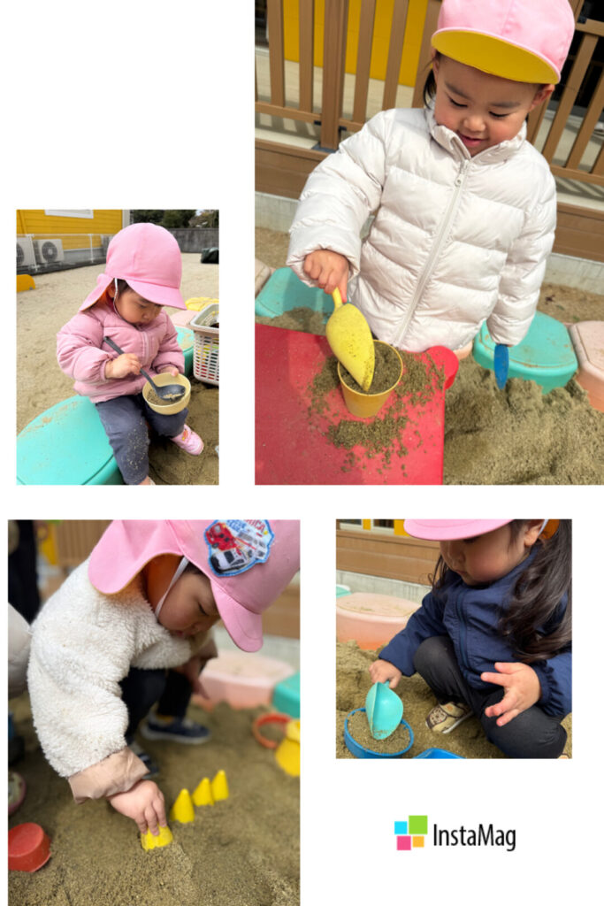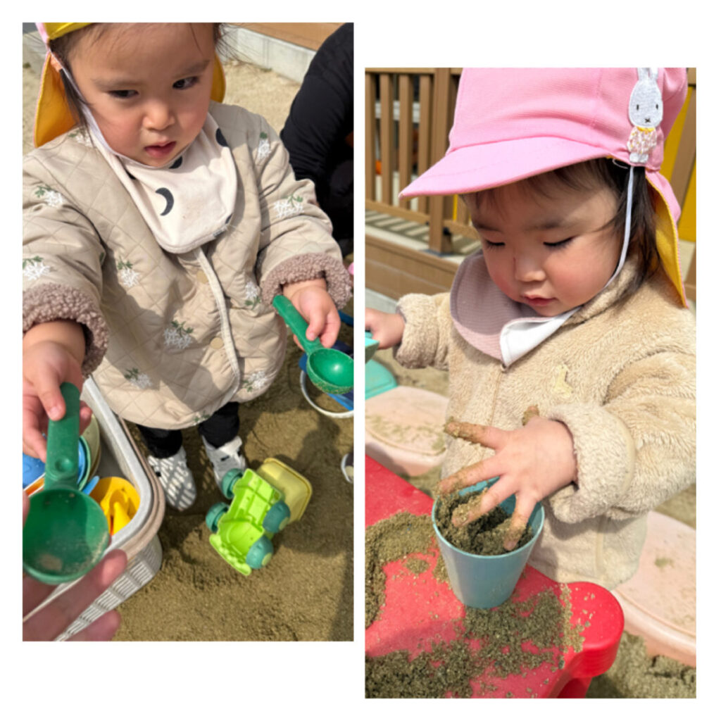 園庭でのびのび遊びましたよ。お友だちとの会話も増え、「いらっしゃいませ〜。」とアイス屋さんが始まったり、「先生、はいどうぞ!!」と先生の分までスコップを持ってきてくれたりと。ゆったり楽しく遊びました😊