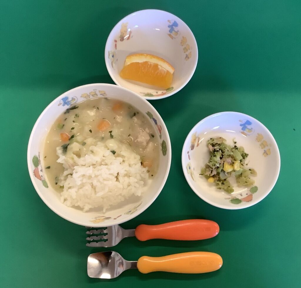 クリームシチュー・ブロッコリーとコーンのサラダ・オレンジ