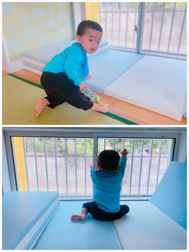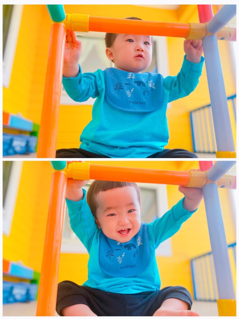 テラスのジャングルジムにつかまって「いないいないばぁー🤗」ニコニコ笑顔がとても可愛かったです🩷