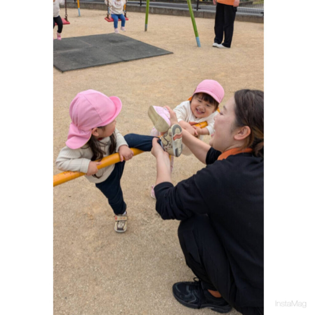 追いかけっこをしたり、ブランコに乗ったり、鉄棒を使い柔軟体操をしたり(笑)