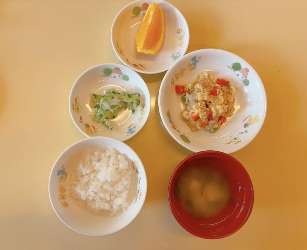 ・ご飯 ・親子煮 ・きゅうりの酢の物 ・オレンジ