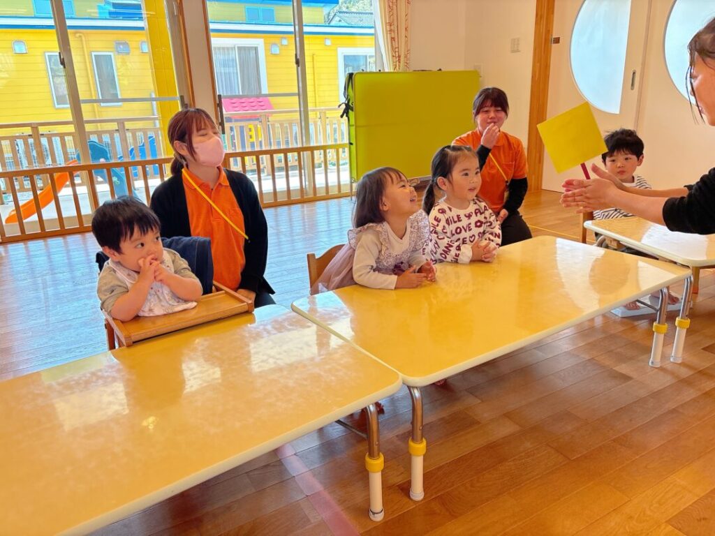 高速で回したペープサートの絵を当てるクイズ。そら組さんはたくさん答えることができていました👏